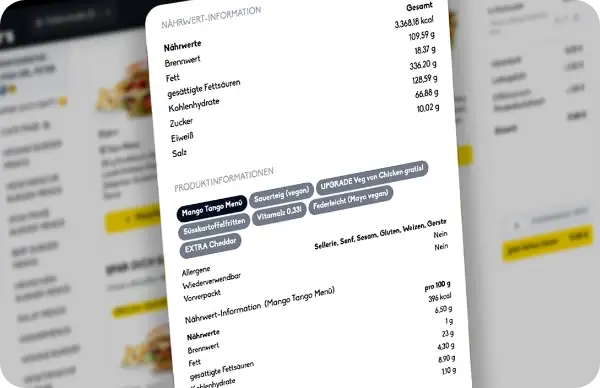 Lege pro Zutat Kalorien, Fett, Proteine und vieles mehr fest. Das System addiert alles automatisch pro Gericht und zeigt umfangreiche Nährwertangaben für deine Gäste an.